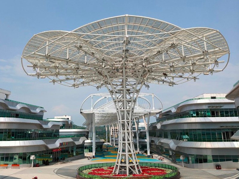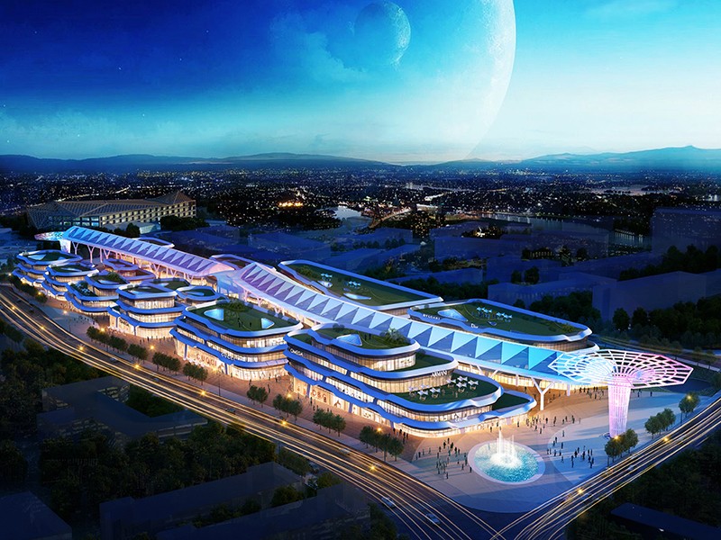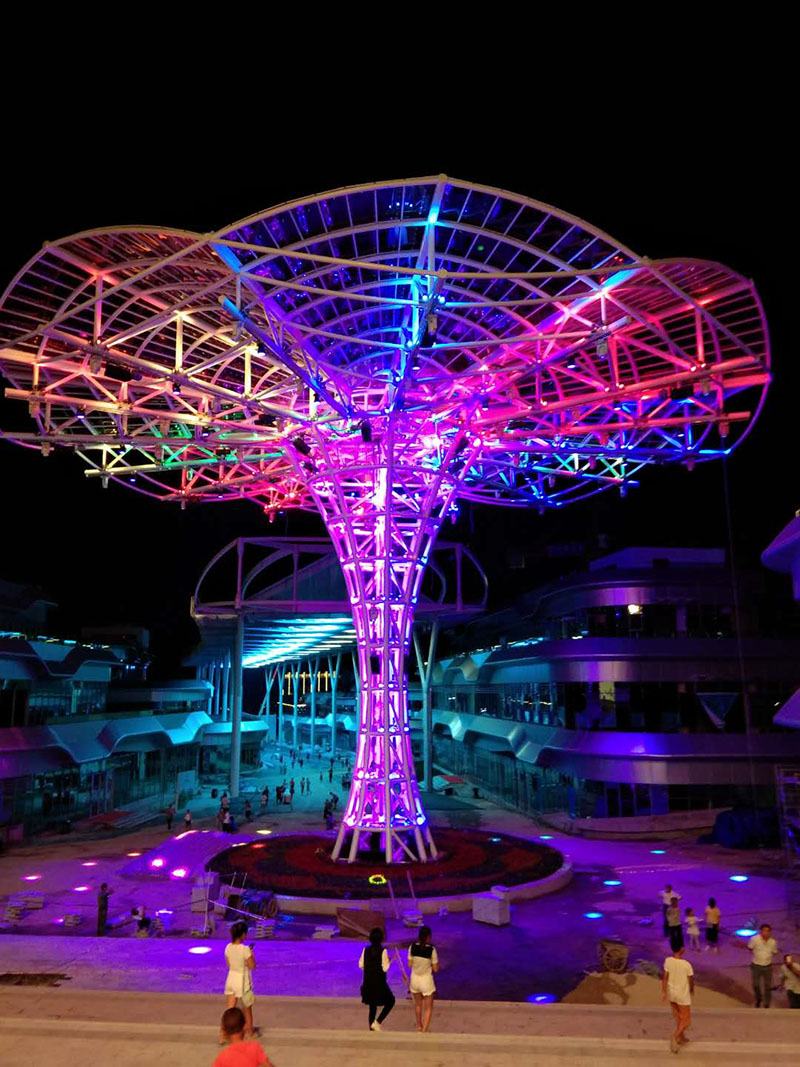 平塘縣天文小鎮(zhèn)天幕街位于貴州省黔南布依族苗族自治州平塘縣,商業(yè)街設(shè)計(jì)長(zhǎng)度為450米,天幕面積8000平方米,顯示屏面積5000平方米。天幕設(shè)計(jì)分東西區(qū),中間為蟲(chóng)洞,采用三角形拼接,形成龍之逆鱗效果,目前是世界異形天幕中面積最大、長(zhǎng)度最長(zhǎng)的天幕街。